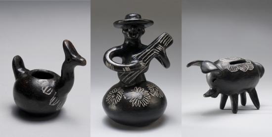 Las piezas se dividen en las categorías de «loza chica» -decorativa ornamental o de forma cerrada- y «loza grande» -utilitaria o de forma abierta-, y se caracterizan por su color negro lustroso y los dibujos blancos incisos que decoran su superficie. Los estrechos vínculos de las alfareras con la realidad natural que las rodea se manifiestan en las formas y diseños ornamentales de las cerámicas, cuyos motivos se inspiran en los personajes, la flora y la fauna del mundo rural.
